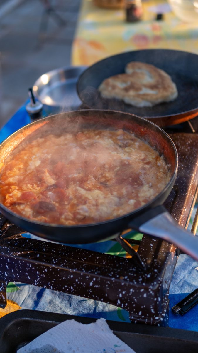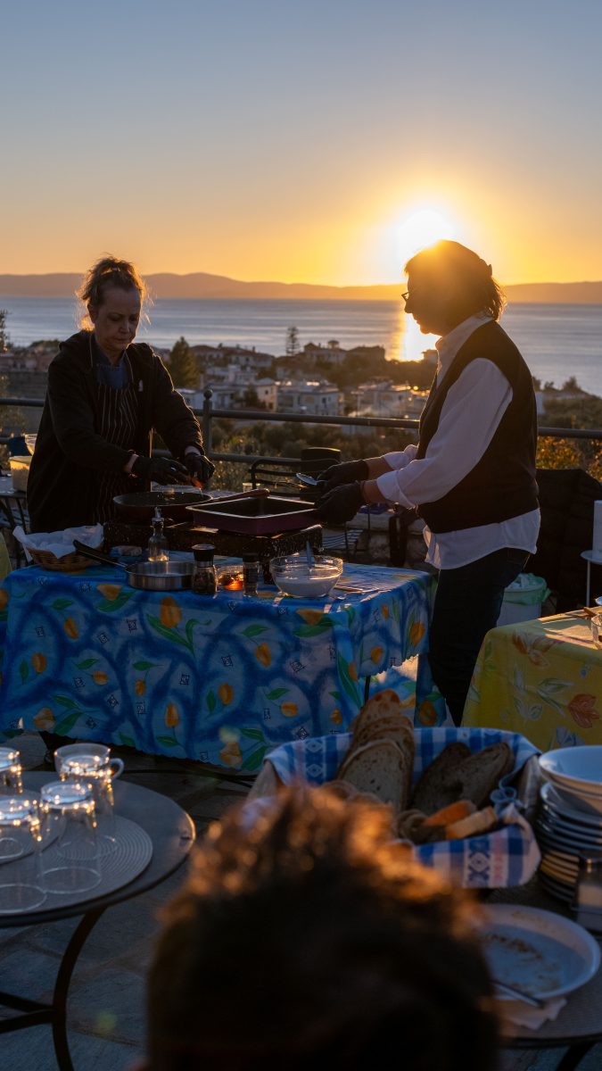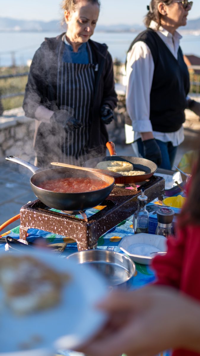 Θα μαγειρέψουμε όλοι μαζί παρέα στη βεράντα, χρησιμοποιώντας αγνά ντόπια υλικά σε παραδοσιακές τοπικές συνταγές. Ένα πλούσιο γεύμα που θα περιλαμβάνει παραδοσιακό ελιόψωμο, μανιάτικη σαλάτα, φάβα με τσιγαριαστές ελιές και κρεμμύδια, καγιανά (με σύγκλινο/σφέλα) και μανιάτικη μακαρονάδα με “καμμένη μυζήθρα και ελαιόλαδο”.
